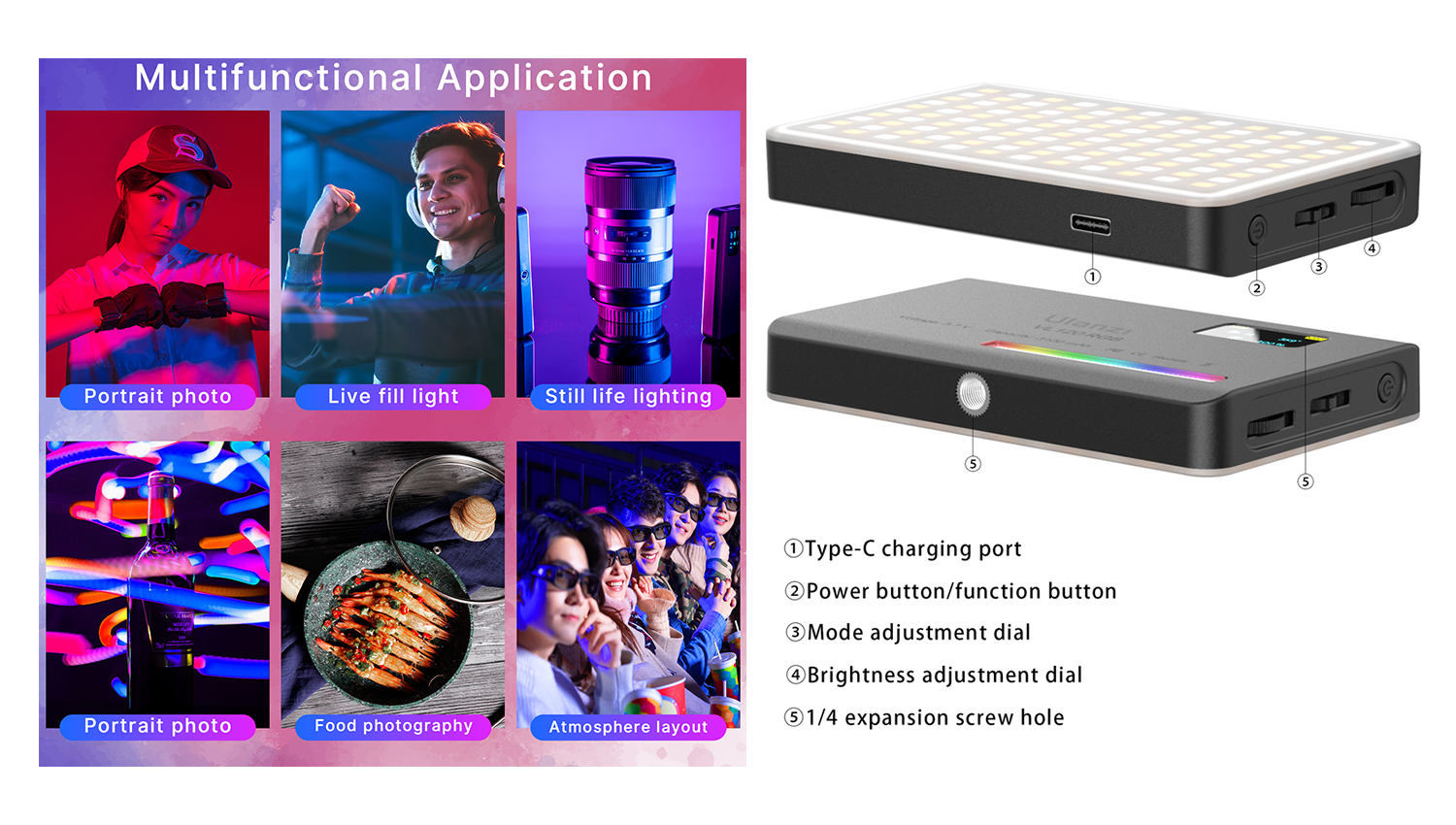 Multiple Lighting Modes: Includes pre-set lighting effects for creative scenarios like lightning, strobe, and SOS modes, enhancing video production.