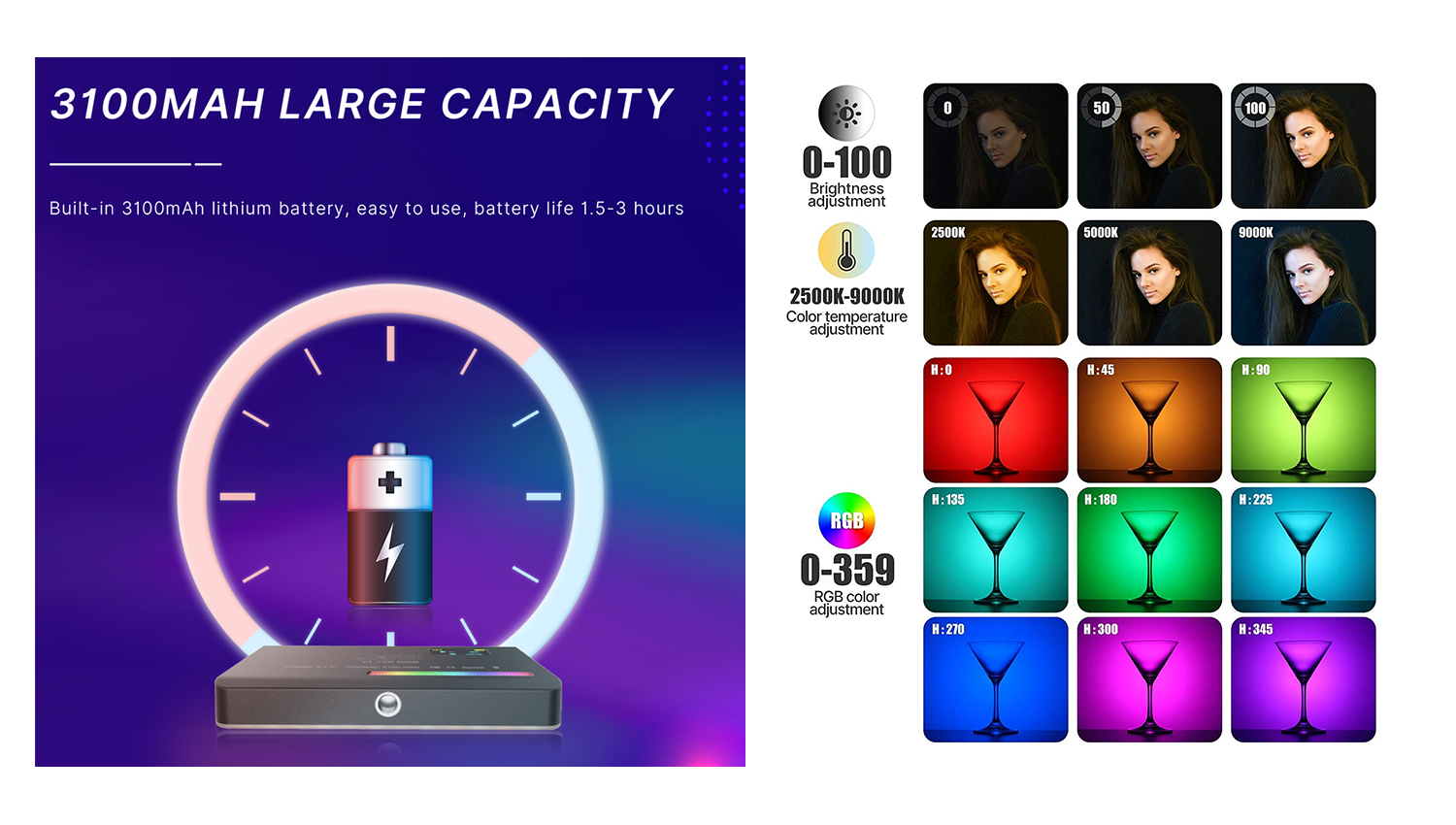 Adjustable Brightness: The brightness is adjustable from 0% to 100%, making it suitable for different lighting needs in both photography and videography.
