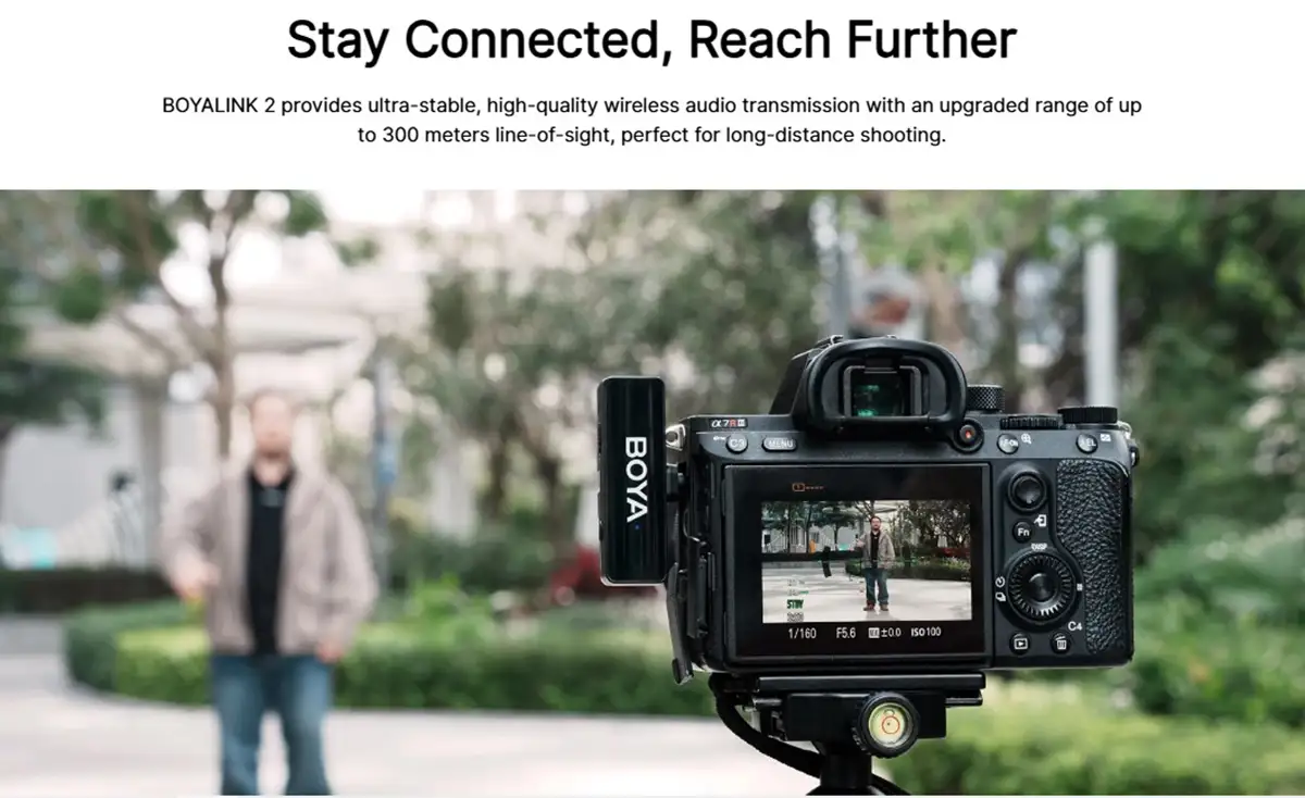 BOYALINK C2 offers a stable wireless range of up to 300 meters (line-of-sight), making it suitable for outdoor shoots, events, and interviews. The 2-level noise cancellation, adjustable via the BOYA Central app, combined with included windshields, helps reduce background and wind noise effectively.