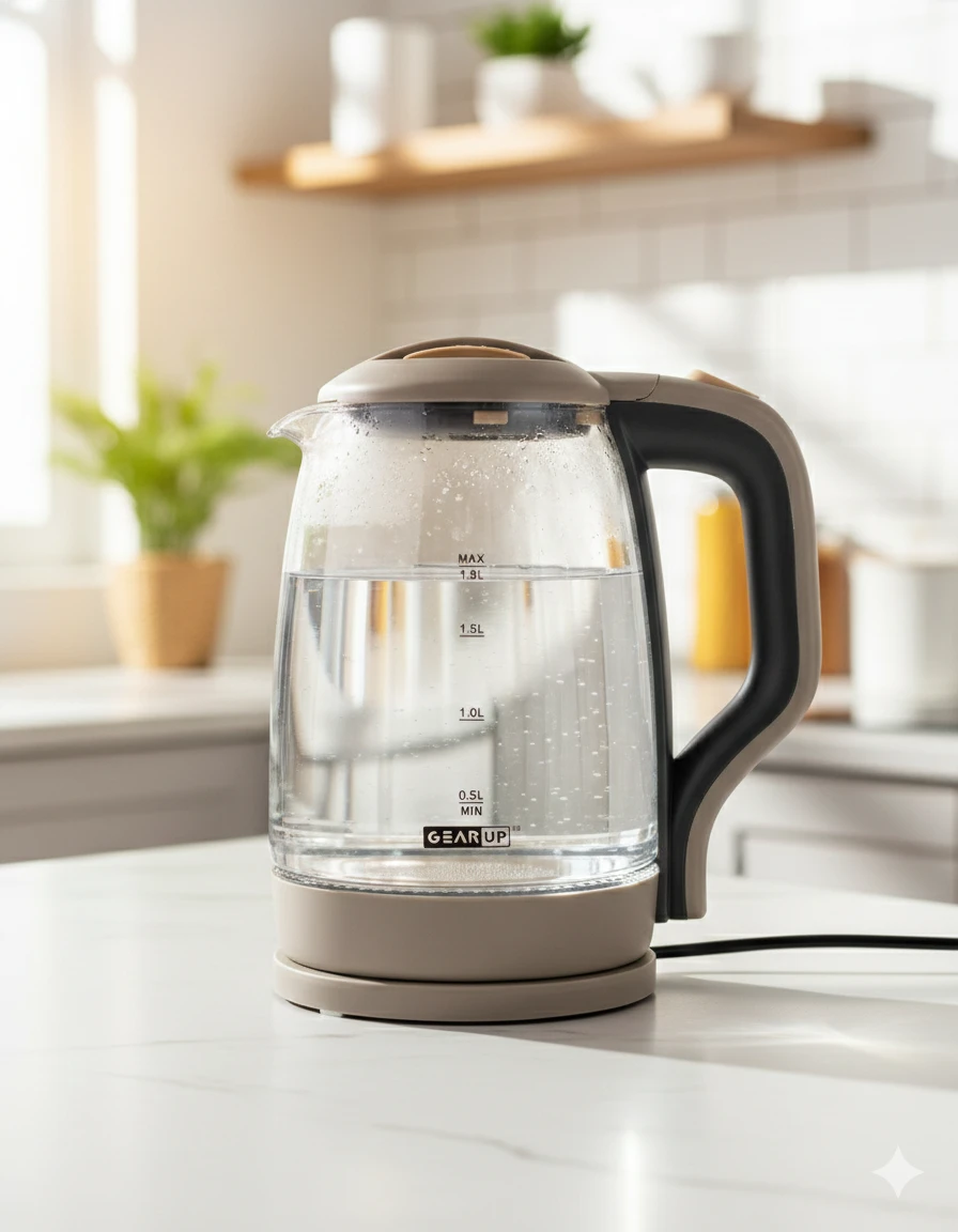 Specifications GearUP GK15 Premium Electric Glass Kettle 1.8L: Brand: GearUP Model: Electric Glass Kettle (GK15) Capacity: 1.8 Liters Power: 1500W Voltage: 220–240V, 50Hz Body Material: Heat-Resistant Glass Base Type: 360° Rotating Cordless Base Heating Element: Concealed Stainless Steel Safety Features: Auto Shut-off, Boil-Dry Protection Indicator: LED Boil Light Handle: Cool-Touch Ergonomic Grip Warranty: 6 Months Replacement