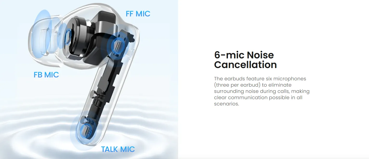 Microphones: 6-mic setup (3 per earbud)