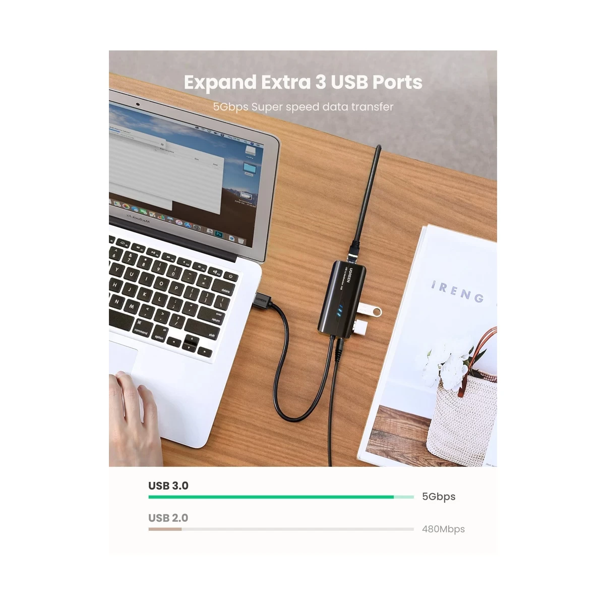 The Ugreen 20265 USB 3.0 Hub with Gigabit Ethernet Converter is the perfect solution for expanding your device's connectivity. It combines a 3-Port USB Hub with a Gigabit LAN Port, making it ideal for laptops and desktops with limited USB and network interfaces.