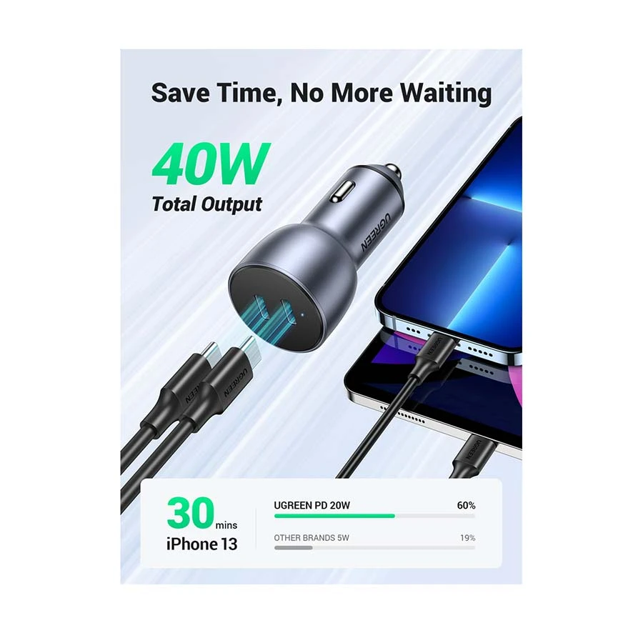 UGREEN CD213 is a dual USB-C car charger delivering up to 50W total output. It allows simultaneous fast charging for two devices with wide protocol support. Compact and travel-friendly, it stays firmly in the car cigarette lighter port while protecting your devices with multiple built-in safety features. Ideal for iPhones, Samsung Galaxy devices, iPads, gaming consoles, cameras, drones, and more.