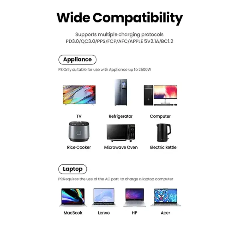 Safety Features: Built-in 13A fuse, surge protection, lightning protection, short circuit, overvoltage, overheating, overcharging protection, child safety protection