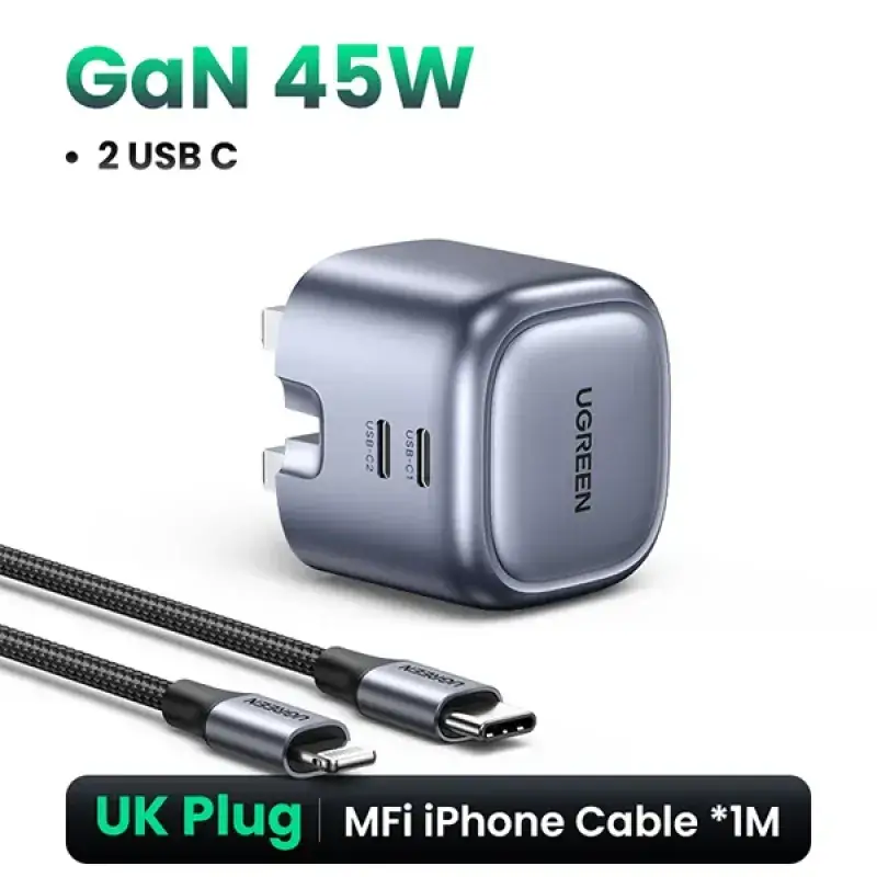 The Ugreen CD294 (90399) Nexode 45W Dual USB-C PD GaN Fast Charger – UK delivers fast, safe, and highly efficient charging in an ultra-compact GaN design. With dual USB-C ports, it supports up to 45W output, making it ideal for smartphones, tablets, iPads, power banks, and more. Its advanced GaN technology ensures cooler operation and higher energy efficiency. The charger supports all major fast-charging standards including PD3.0, PPS, QC4.0, QC3.0, FCP, AFC, and Samsung 25W/45W fast charging.