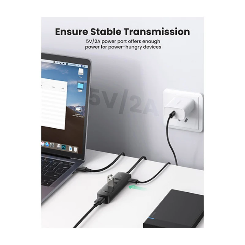 The Ugreen CM416 (80657) USB 3.0 4-Port Hub 1M efficiently solves the problem of limited USB ports on your laptop or desktop. With three USB 3.0 Type-A ports and one USB Type-C power input, this hub expands your connectivity options while maintaining ultra-fast transfer speeds of up to 5Gbps, allowing you to transfer large files and HD videos in seconds.