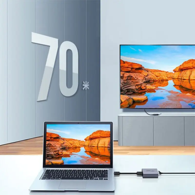 The UGREEN CM455 (20519EU) HDMI Extender extends HDMI signals up to 70 meters (210 feet) while maintaining excellent audio and video quality. It features a durable aluminum casing, HDCP compliance, and strong audio format support including DTS and Dolby. Ideal for home, office, conference rooms, and classrooms, it delivers stable, long-distance signal transmission without loss.