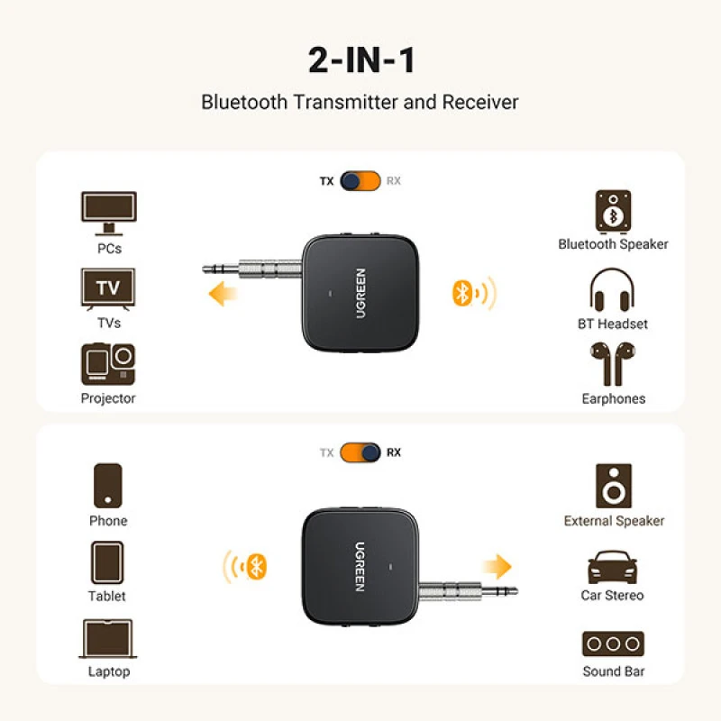 The UGREEN CM667 Bluetooth 5.2 Audio Transmitter Receiver is a versatile audio converter that allows your non-Bluetooth devices to communicate wirelessly. In TX mode, it transmits audio from devices like your TV, PC, or airplane systems to Bluetooth earphones or speakers. In RX mode, it receives audio from smartphones or tablets and streams it to car stereos or home speakers via AUX.