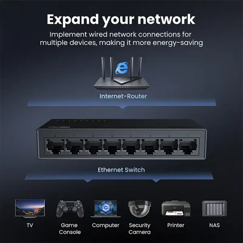 The Ugreen CM834 (35499EU) 8-Port Gigabit Ethernet Switch is a powerful and easy solution for extending your wired network in homes, offices, schools, or security setups. It offers 8 Gigabit ports with auto-negotiation supporting 10/100/1000 Mbps speeds, ensuring fast and seamless connections for multiple devices like computers, printers, IP cameras, and smart TVs.