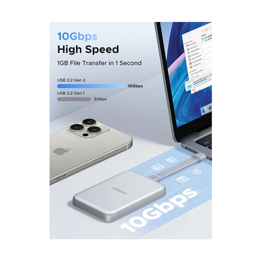The UGREEN D619 (55151) Magnetic M.2 NVMe SSD Enclosure is built for creators, professionals, and users who need high-speed external storage on the go. With USB 3.2 Gen 2, it reaches speeds up to 10Gbps, perfect for 4K/8K video transfer, ProRes recording, and large file handling.
