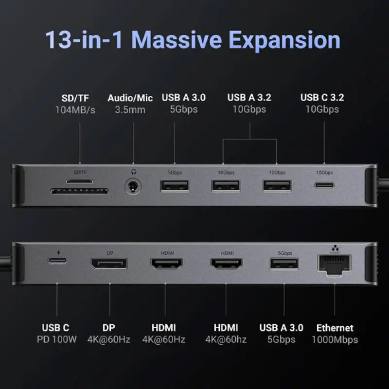 With 10Gbps USB-C and USB-A ports, you can move large files instantly and improve workflow efficiency. The 100W PD input provides up to 85W laptop charging, keeping your devices powered throughout the day. The docking station also includes Gigabit Ethernet, SD/TF card slots, and a 3.5mm audio port—offering complete connectivity in one compact device. Compatible with major USB-C laptops like Dell XPS, Lenovo ThinkPad, ASUS ZenBook, and more, the UGREEN Revodok Pro 313 enhances performance for professionals, creators, and power users.