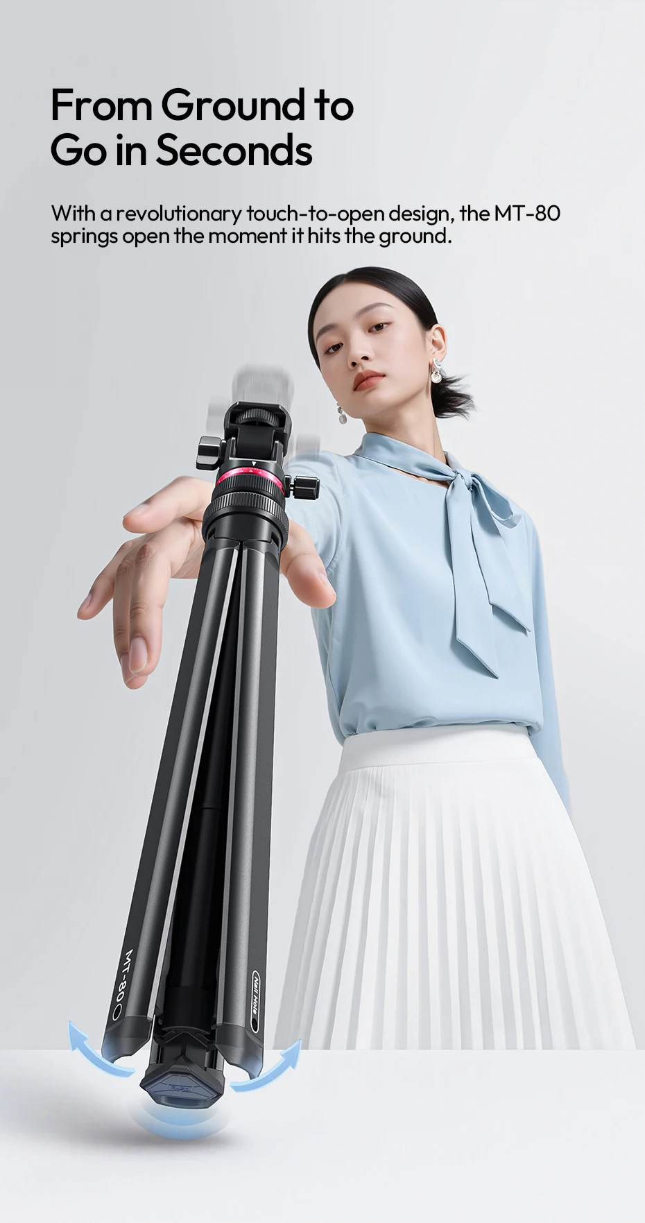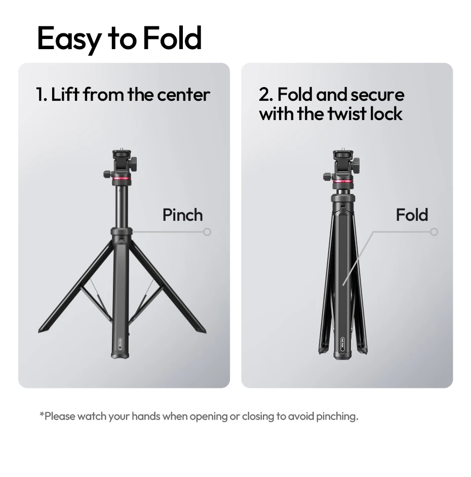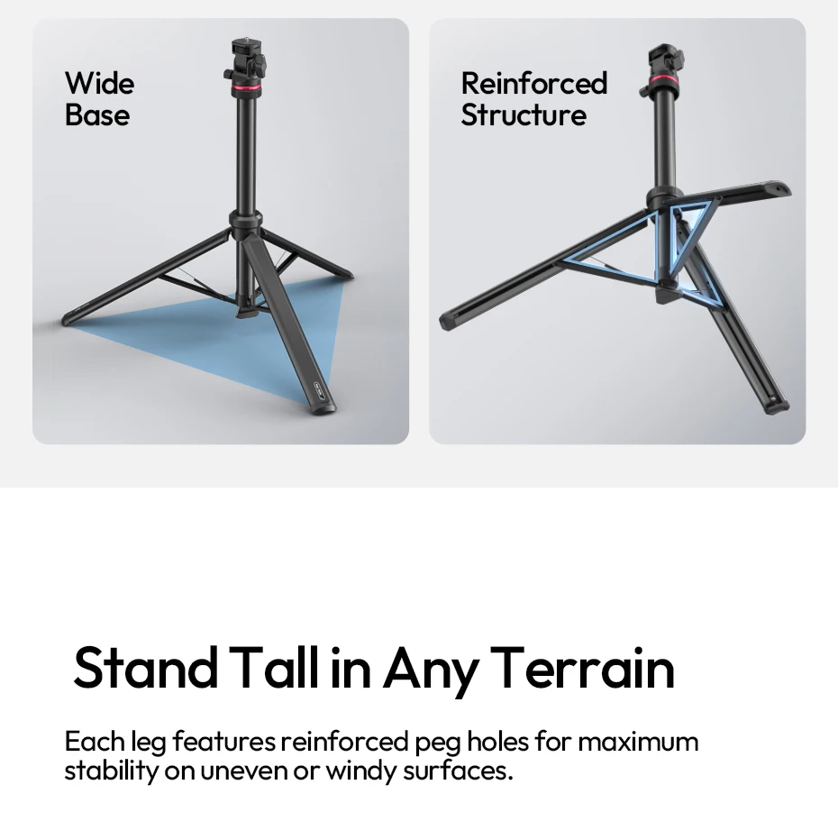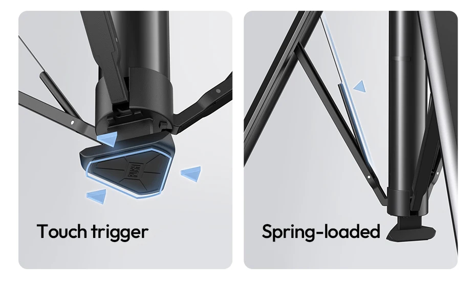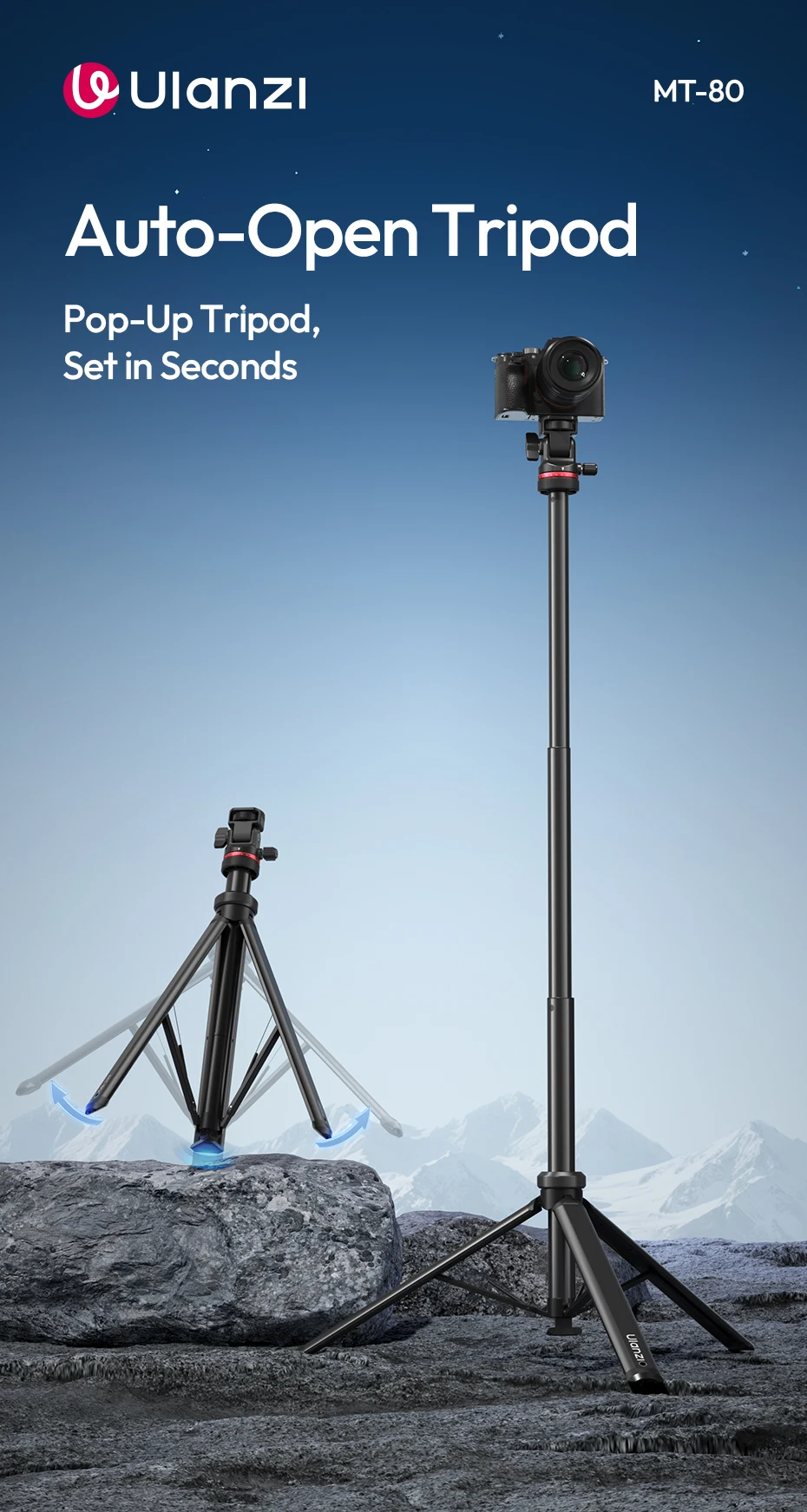 Auto-Open Mechanism: Touch-to-open design, tripod pops open instantly when placed on the ground