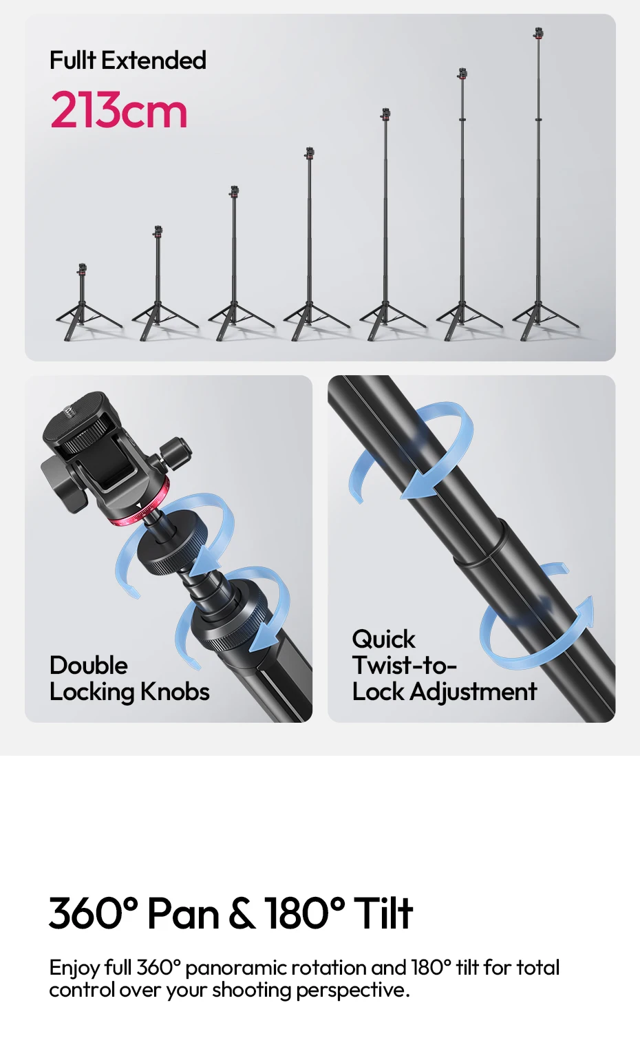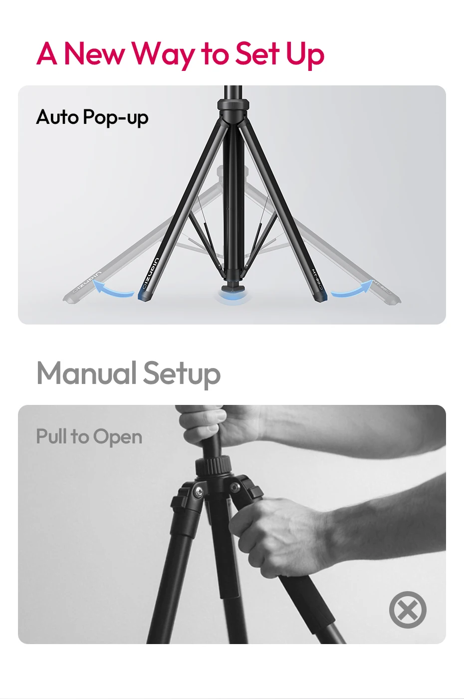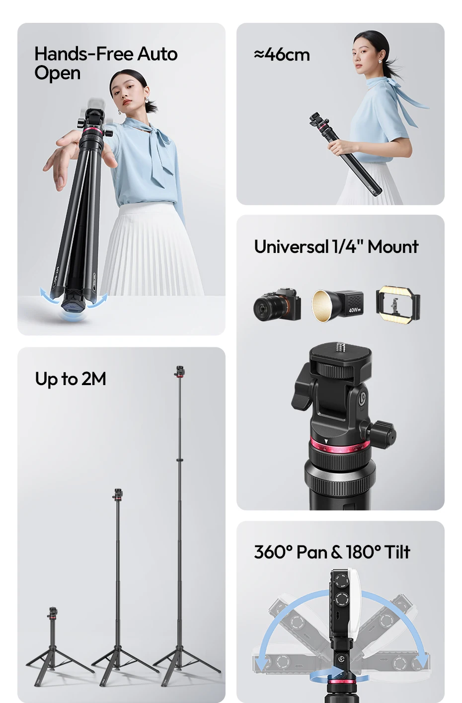 Auto-Open Mechanism: Touch-to-open design, tripod pops open instantly when placed on the ground