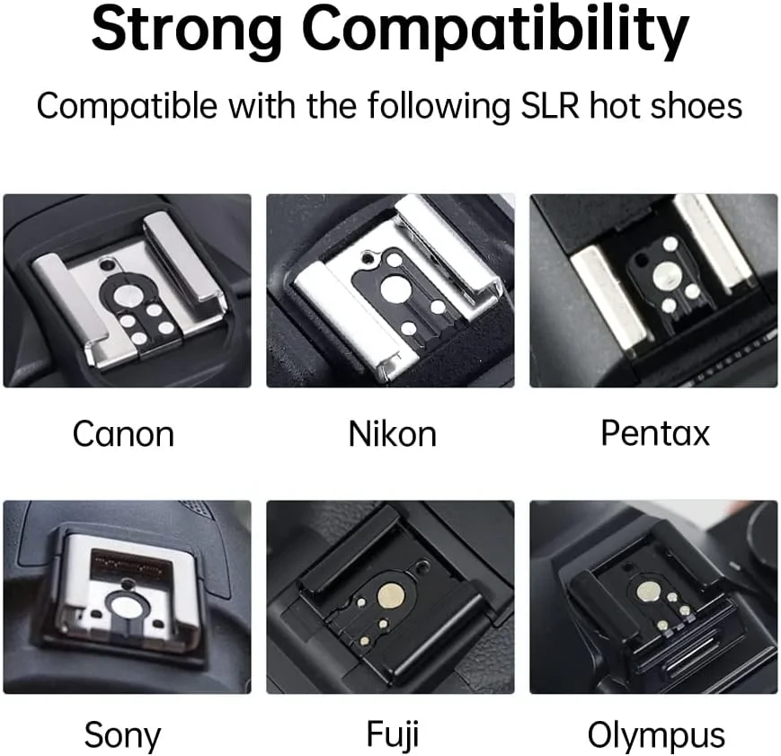 Hotshoe Interface: Compatible with various DSLR camera brands (e.g., Canon, Nikon, Pentax, Olympus).