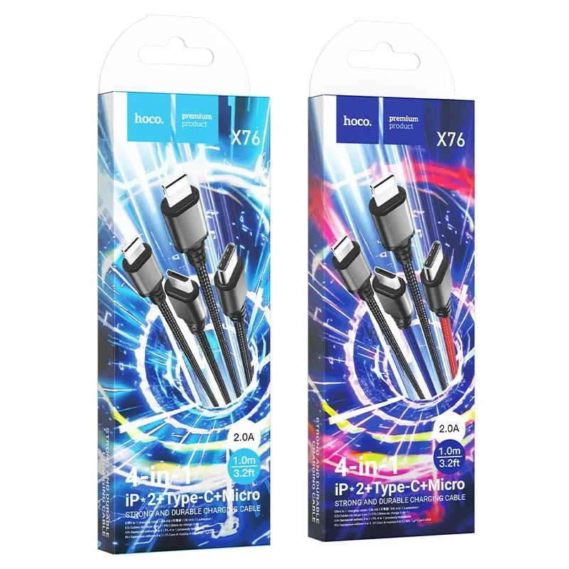 The Hoco X76 4-in-1 Super Charging Cable (Type-C+Type-C+iP+Micro) is available now in Bangladesh. Get the original products at the most affordable price only at Ajkershop and enjoy the quality with the promise of the best customer service in Bangladesh.