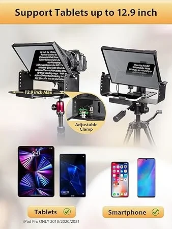 The teleprompter can accommodate tablets up to 12.9 inches in size, including the iPad Pro models from 2018, 2020, and 2021, as well as various smartphones. This makes it versatile for different devices.
