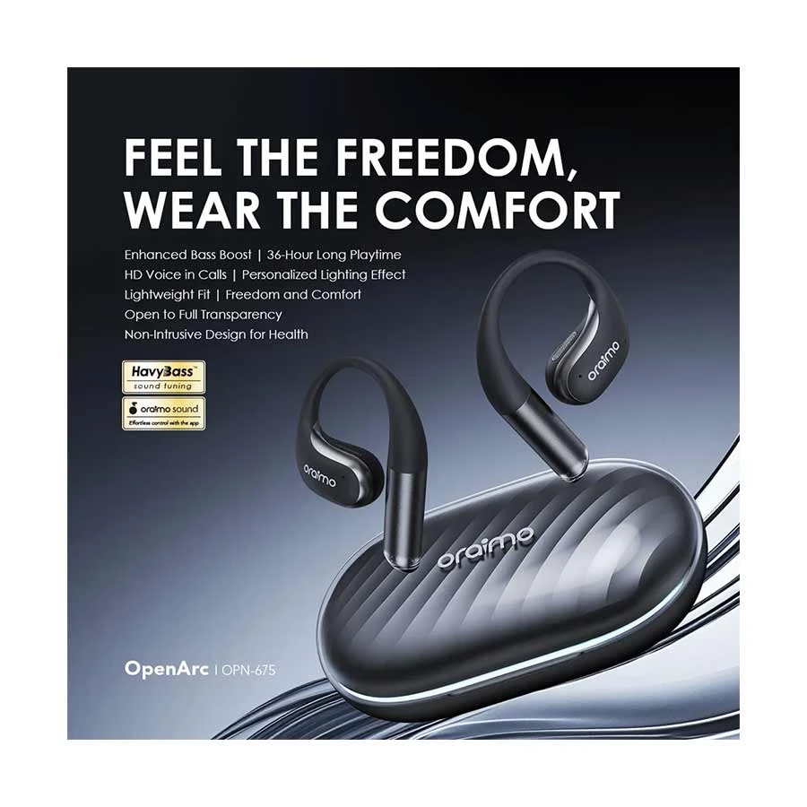 The Oraimo OpenArc ENC OPN-675 Open-Ear TWS Bluetooth Earbuds are designed for users who want freedom, comfort, and awareness without compromising sound quality. Featuring advanced open-ear air conduction technology, these earbuds allow you to enjoy music while staying aware of your surroundings—ideal for outdoor activities, workouts, and daily commuting.