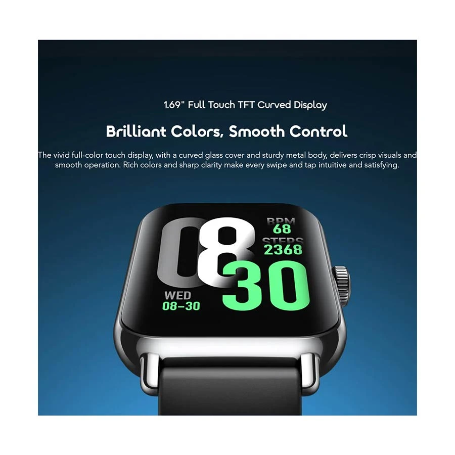 Full Touch TFT Curved Display with smooth control, AI-generated watch faces, and a durable metal body. Includes a free extra strap, blood oxygen and heart rate monitoring, and HD Bluetooth calling directly from your wrist. Crisp visuals, smooth navigation, and convenient everyday health tracking make it a reliable smart companion.
