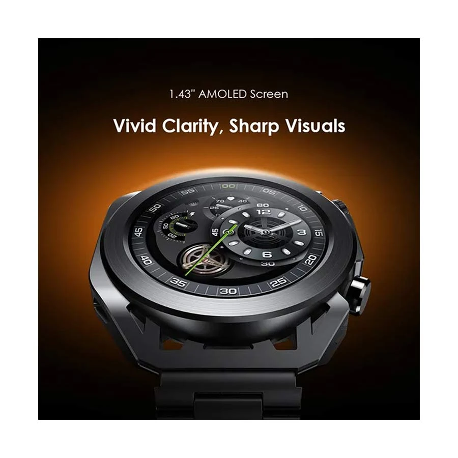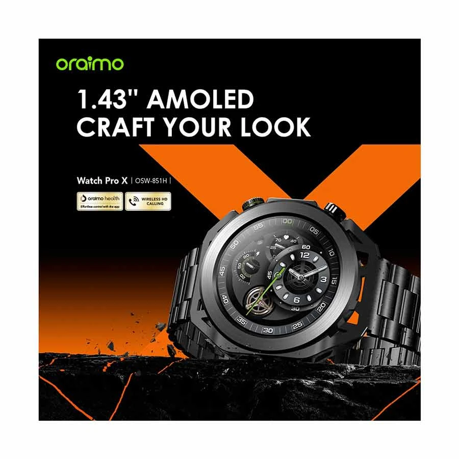 The Oraimo Watch Pro X OSW-851H is a premium AMOLED Bluetooth calling smartwatch designed for both men and women. It features a vibrant 1.43-inch AMOLED display with sharp 466 × 466 resolution and durable anti-scratch Panda Glass, ensuring vivid visuals and long-lasting protection.