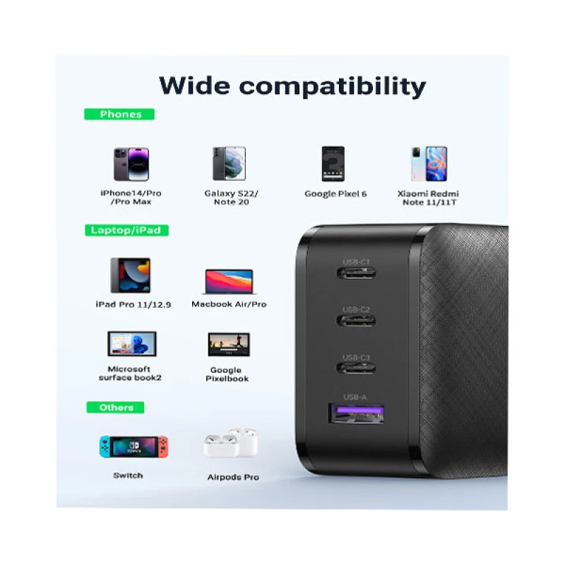 Simultaneous Output: Charge 4 devices at once with a total of 65W shared intelligently
