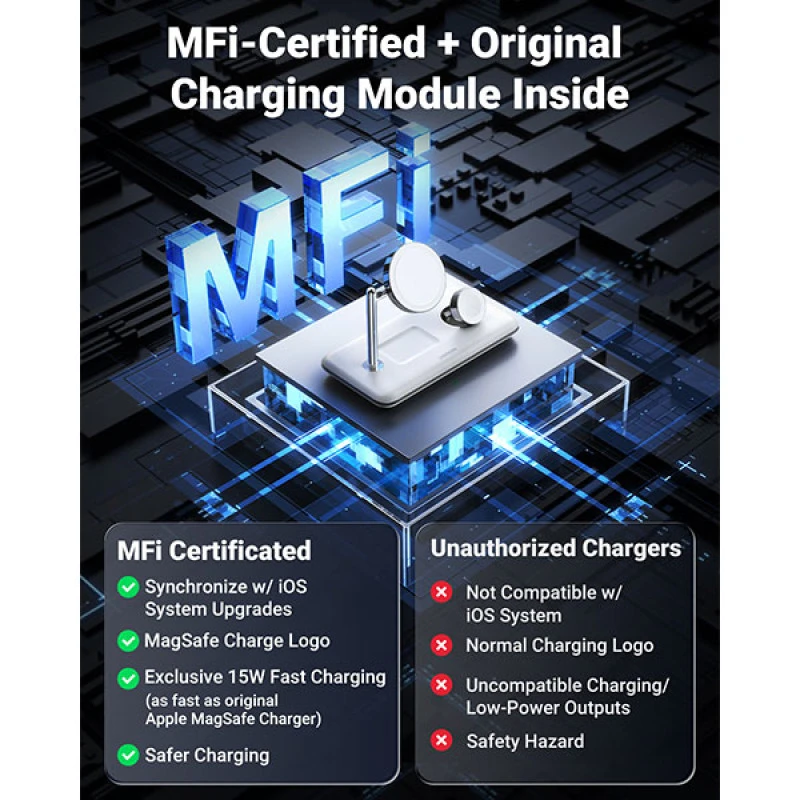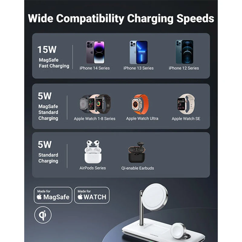 The UGREEN CD278 3-In-1 MagSafe Wireless Charging Station is your all-in-one charging solution for Apple devices. Say goodbye to cluttered cables — charge your iPhone, Apple Watch, and AirPods simultaneously with just one sleek and compact dock.