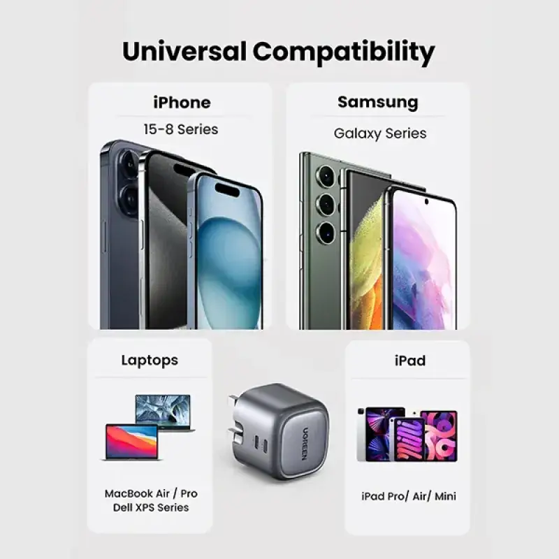The Ugreen CD294 (90399) Nexode 45W Dual USB-C PD GaN Fast Charger – UK delivers fast, safe, and highly efficient charging in an ultra-compact GaN design. With dual USB-C ports, it supports up to 45W output, making it ideal for smartphones, tablets, iPads, power banks, and more. Its advanced GaN technology ensures cooler operation and higher energy efficiency. The charger supports all major fast-charging standards including PD3.0, PPS, QC4.0, QC3.0, FCP, AFC, and Samsung 25W/45W fast charging.