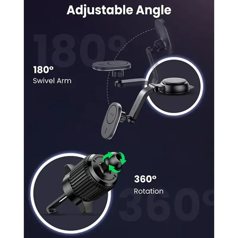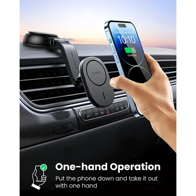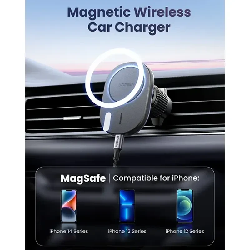 The Ugreen CD345 (15120) 15W Magnetic Car Wireless Charger is now available in Bangladesh. This high-performance car charger combines MagSafe-compatible wireless charging with strong magnetic hold and flexible mounting options. Buy the original Ugreen CD345 charger from Ajkershop and enjoy fast delivery, official warranty, and unbeatable service.