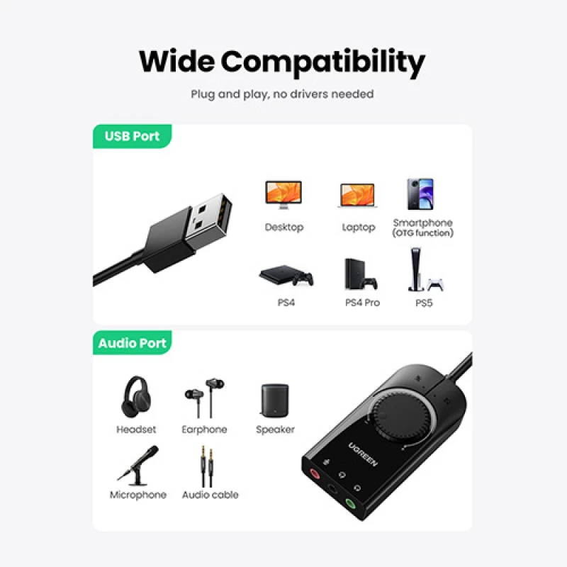 The UGREEN CM129 USB External Stereo Sound Adapter is the ultimate upgrade for your audio experience. It’s equipped with gold-standard SSS1629 chipset technology and high-performance ports to ensure rich, detailed sound. The adapter features a built-in volume control and mute switch for both microphone and headphone outputs, along with an OTG cable for connecting external microphones. Its plug-and-play setup makes it perfect for anyone—from gamers to professionals—who need reliable and portable sound solutions. Whether you're recording vocals or attending virtual meetings, the CM129 delivers noise-free, professional-grade audio every time.
