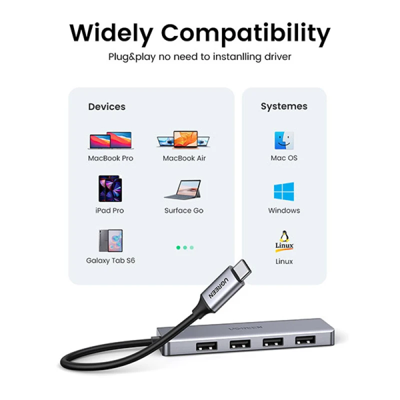 The UGREEN 70336 Type-C to USB Hub (CM219) is a compact and stylish USB-C to 4-Port USB 3.0 converter that allows you to connect legacy USB-A devices like flash drives, keyboards, external HDDs/SSDs, and more to your modern USB-C laptop or tablet. It's perfect for devices like MacBook Pro/Air, iPad Mini 6, Dell XPS, HP Spectre, Samsung Galaxy, Chromebook, and more.