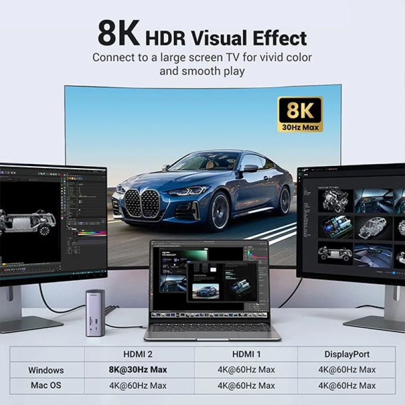 The Ugreen CM555 Revodok Pro is designed to maximize your productivity with a Triple Display Dock setup, making it perfect for multitasking and professional workloads. Supporting up to 8K video output, this docking station ensures crystal-clear visuals for content creators, gamers, and professionals. With high-speed data transmission and extensive connectivity options, it transforms your working or entertainment setup into a powerful hub.