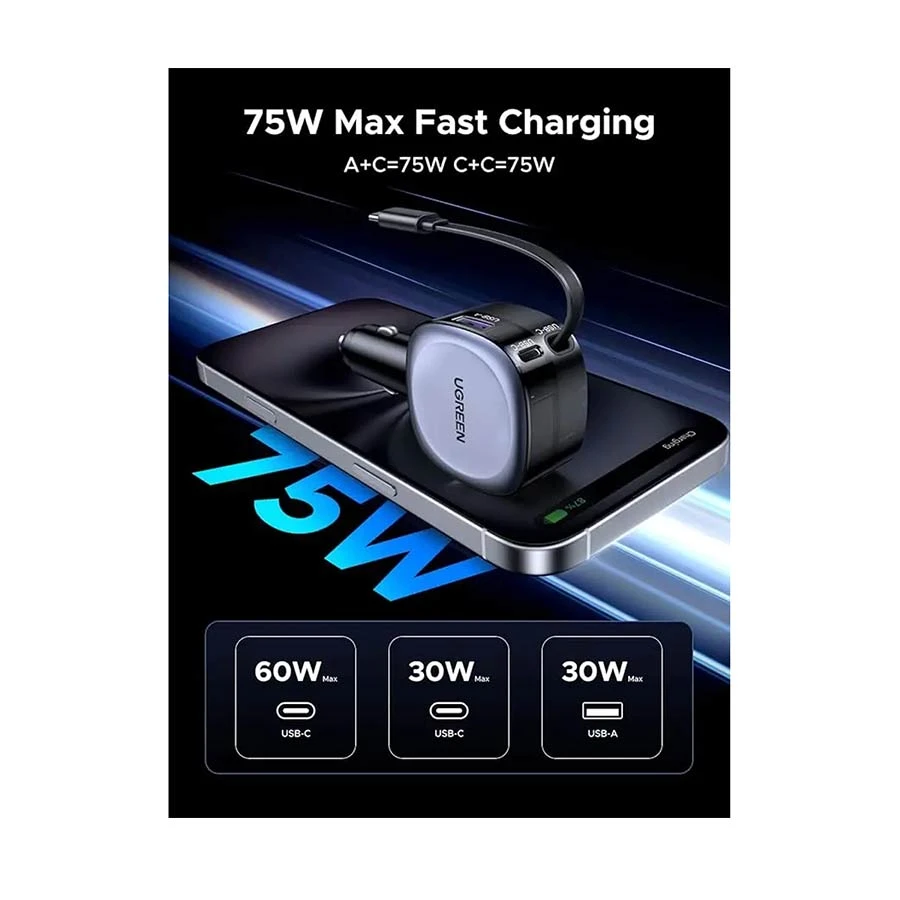 Specifications for the Ugreen EC601 (55653) 75W Fast Car Charger with Retractable Cable: