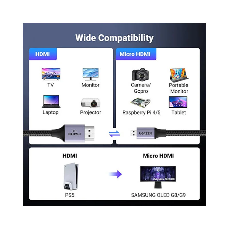 The Ugreen HD164 (15516) 8K Micro HDMI to HDMI Cable is available now in Bangladesh. Get the original Ugreen products at the most affordable price only at Ajkershop and enjoy the quality with the promise of the best customer service in Bangladesh.