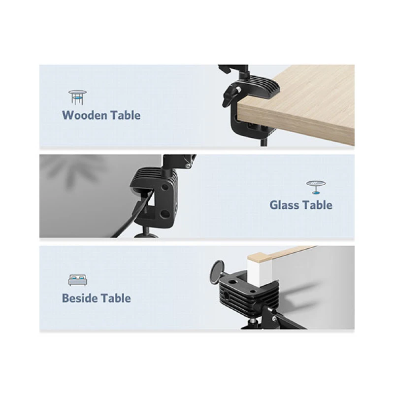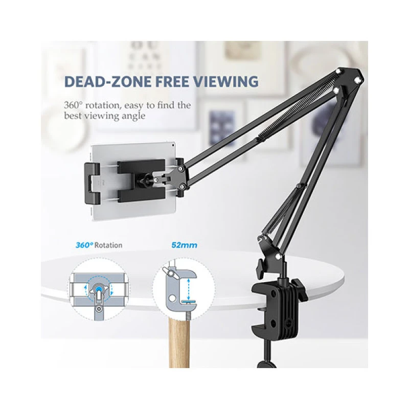 The clamp base fits surfaces up to 4.7 cm thick and features rubber padding to prevent scratches on furniture. With holes in the cradle for cable access, you can keep your device charged during use. It’s ideal for video calls, reading, watching movies, gaming, or attending virtual meetings—all while keeping your hands free.