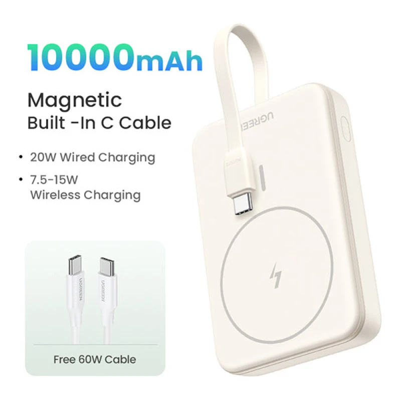 The Ugreen PB760 10000mAh Magnetic Wireless Power Bank combines compact design with high-speed performance. With both MagSafe-style wireless charging and a built-in USB-C cable, this power bank is the perfect companion for iPhone users and other USB-C compatible devices.