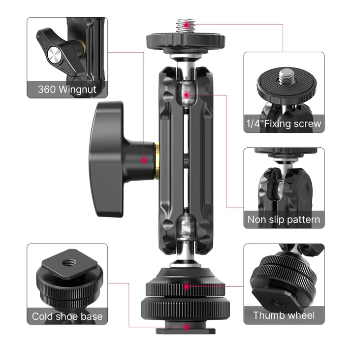 Two ball joints allow for full 360° angle adjustments and can be securely locked with a single knob.