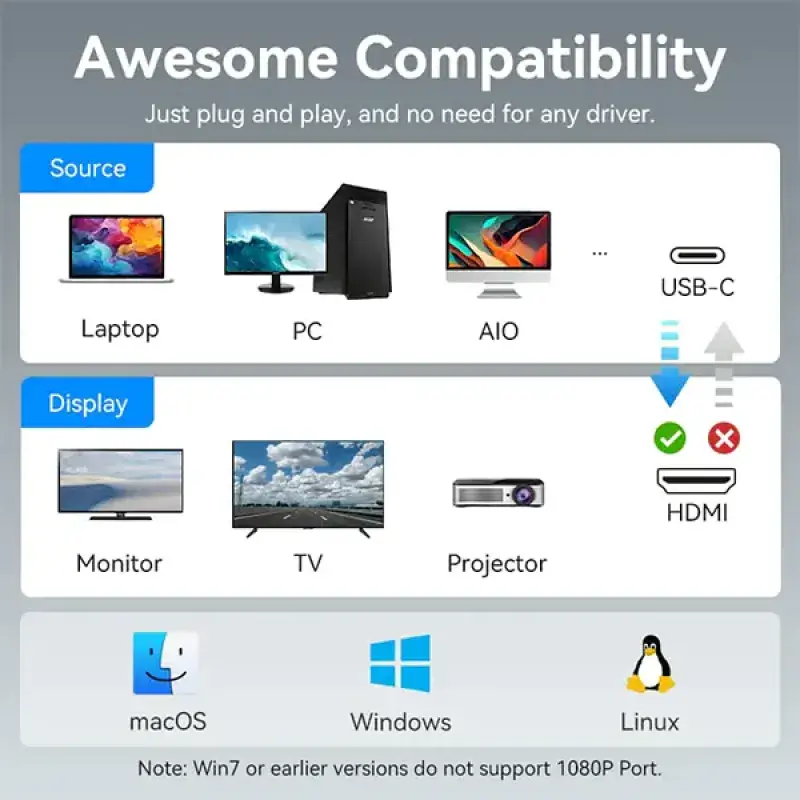 Universal compatibility with laptops, tablets, and devices supporting USB-C display output